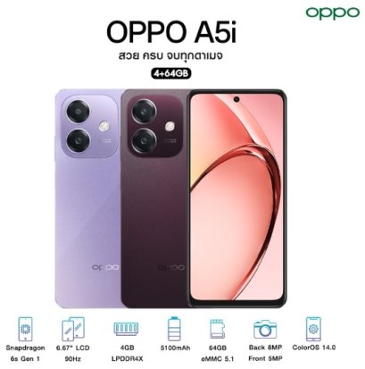 OPPO A5i RAM4GB / ROM64GB จอ 6.67 แบตเตอรี่ 5,100mAh ชาร์จเร็ว45W Type-C