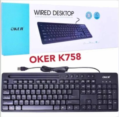 KEYBOARD OKER KB-758 คีย์บอร์ดหัวเสียบ USB มีช่องวางมือถือ ตัวหนังสือเป็นแบบเลเซอร์ ทนทานตัวหนังสือไม่จางง่าย คุณภาพดีใช้นาน