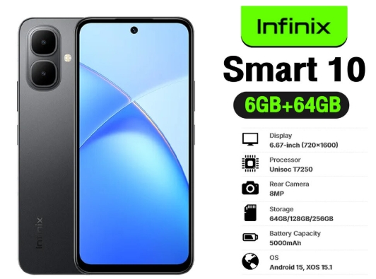 Infinix Smart 10 (รุ่นปี 2025) เป็นสมาร์ทโฟน 4G ราคาประหยัดที่เน้นความคุ้มค่า โดดเด่นด้วยหน้าจอใหญ่ 6.7 นิ้ว IPS LCD ความละเอียด HD+ รีเฟรชเรท 120Hz ลื่นไหล สว่างสูงสุด 700 nits ขับเคลื่อนด้วยชิป Unisoc T7250, แบตเตอรี่ 5,000mAh ชาร์จไว 15W, กล้องหน้า-หลัง 8MP และรันบน Android 15 (Go Edition) รองรับการใช้งานทั่วไปได้ดี
